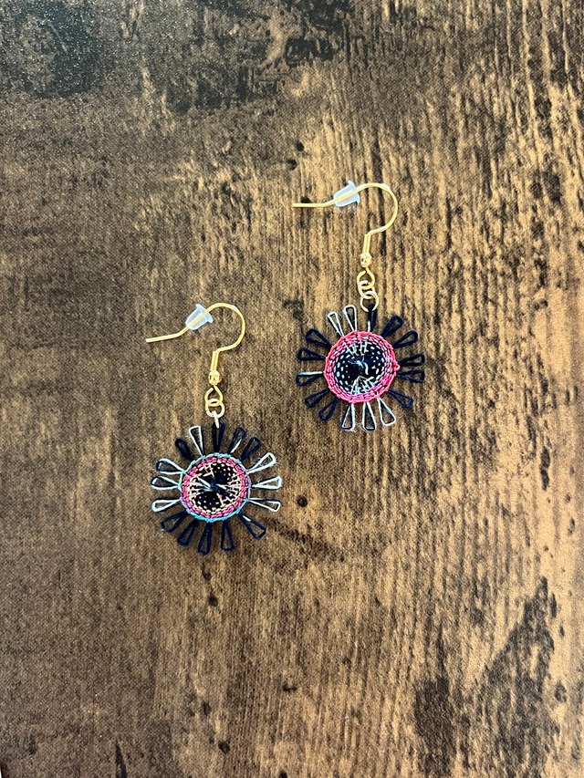 伝統的な藍染め糸と絹糸を用い、独自の趣を持つニャンドゥティピアスです。