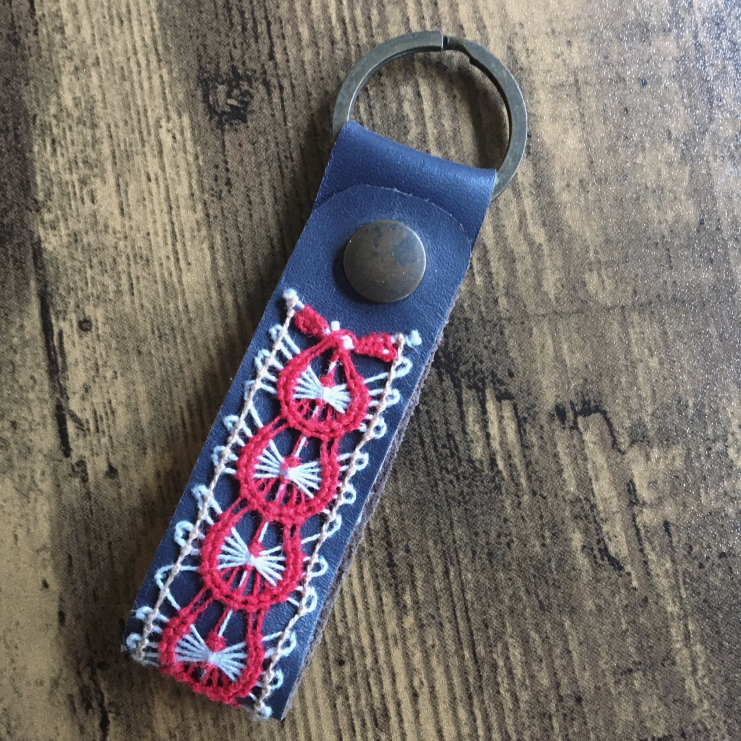 タイの職人さんがひとつひとつ手作りした、レザーキーホルダーにニャンドゥティを縫い付けました。 スナップボタンが付いており、 カバンの取っ手などに留められるのがとても便利です。 【長さ】約11センチ(キーホルダー部分含)